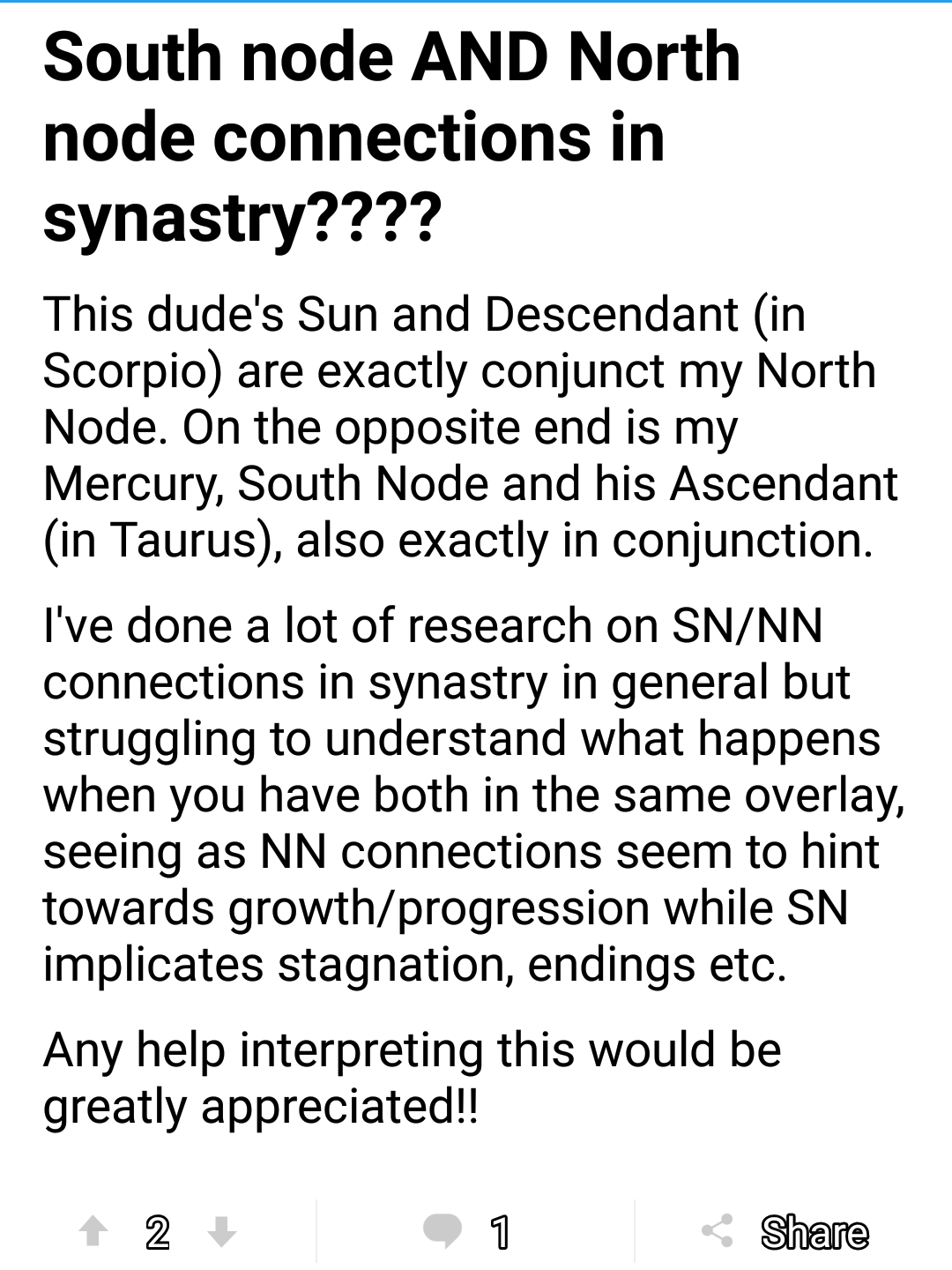 Is there a chance you can post the Chart? Personally, I am a visual person. I have heard that nodal contact implies that there are karmic connections involved in the relationship. Like whoever has the south node helps the North node person resolve issues in this life due to the experience gained in the South node person’s past life for example. The planets and nodal ruler’s condition should add more information. His sun being conjunct your North Node would imply there is a futuristic element to your relationship. So maybe you will always be friends, get married or grow old together. According to Celeste Teal you can help each other in the career department. The person with the North Node is a ray of sunshine for the other Celeste says try not to, “parent,” one another.