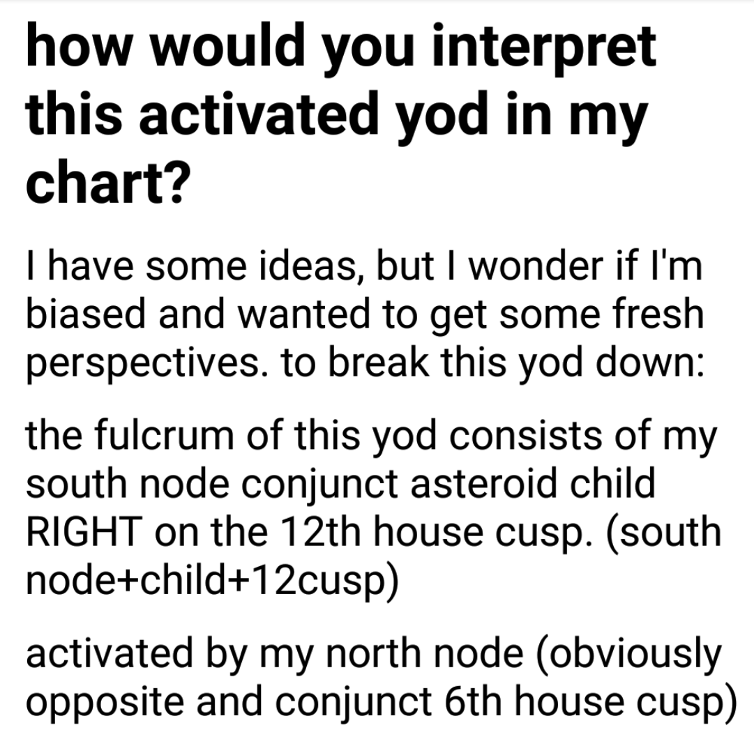 Patterns are really cool. Especially yods, they are special. The best way to understand your yod is to break it down is one aspect at a time imo. Alot of people see patterns and look at them as one entity. They over look the three aspects it takes to make a t square, yod, grand trine in the first place. I interpret the aspects One by one.