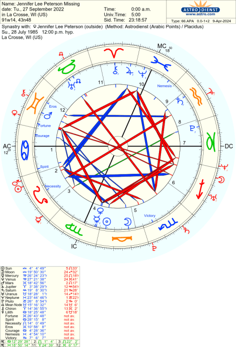 Jennifer Lee Peterson went missing on the 27th of September 2022. She was last seen at 12:00 am in La Crosse, WI and then she vanished into thin air. I am surprised that there is such a little amount of information available. If you have any information regarding her where abouts please contact the La Crosse PD. Before I begin this reading I would like to remind everyone to hold on to hope for Jennifer and her family. This is just an astrology reading, and forensic astrology readings can be inaccurate so we must all hope for the best regardless of what it says. This post is not being created to be correct or incorrect about what has happened. It is being released because we need to raise awareness and get more attention on this case.